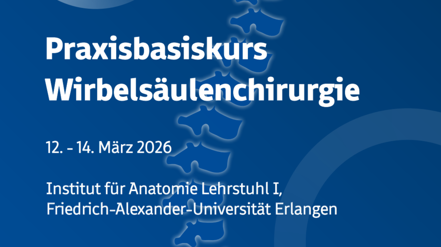 Der Praxisbasiskurs „Wirbelsäulenchirurgie – Präparation und Instrumentation“ richtet sich an junge Assistenzärzte, die ihr Wissen über die Anatomie und Instrumentierung der Wirbelsäule vertiefen möchten. Der Kurs besteht aus einem theoretischen und einem intensiven praktischen Teil. Die Teilnehmerzahl ist auf fünf Personen pro Präparationstisch begrenzt, um einen engen Austausch mit den Tutoren zu ermöglichen. Geübt werden unter anderem die chirurgische Anatomie, der Zugang zur Wirbelsäule sowie die Instrumentierung mit Stab-Schraubensystemen, Verplattungen und Wirbelkörperersatz. Alle Tische sind mit modernen C-Bögen und Präparationsinstrumenten ausgestattet.